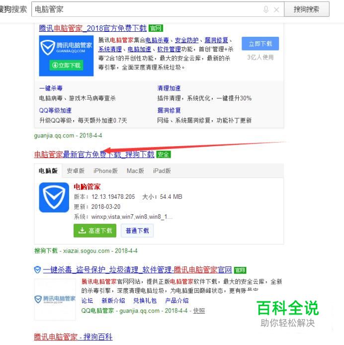 首先,我们用搜狗搜索电脑管家这个软件,下载并安装。