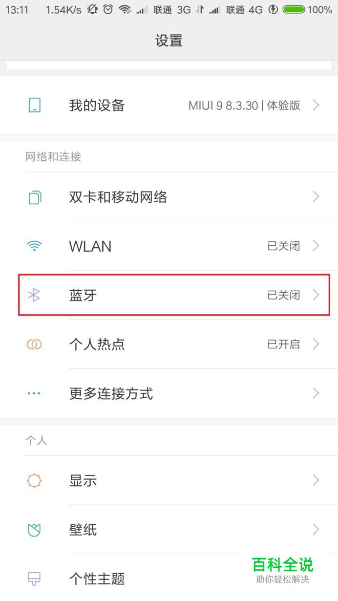 打开MIUI系统中的设置应用,点击“蓝牙”设置项,进入蓝牙设置页面。