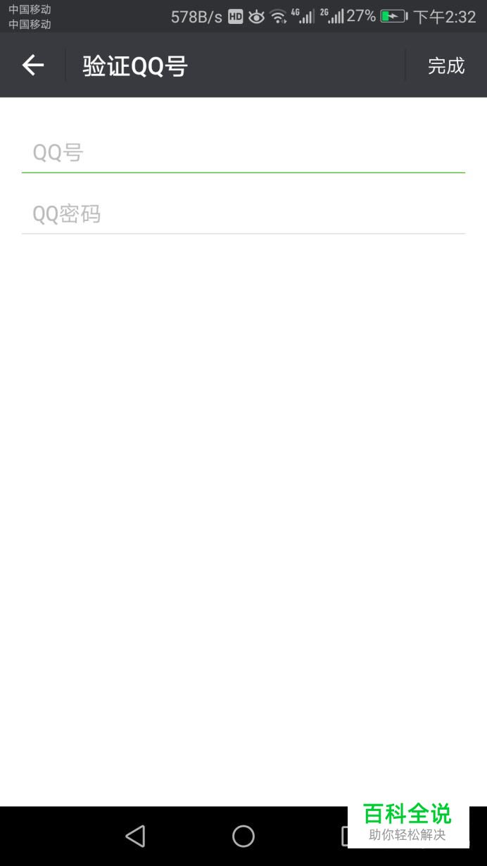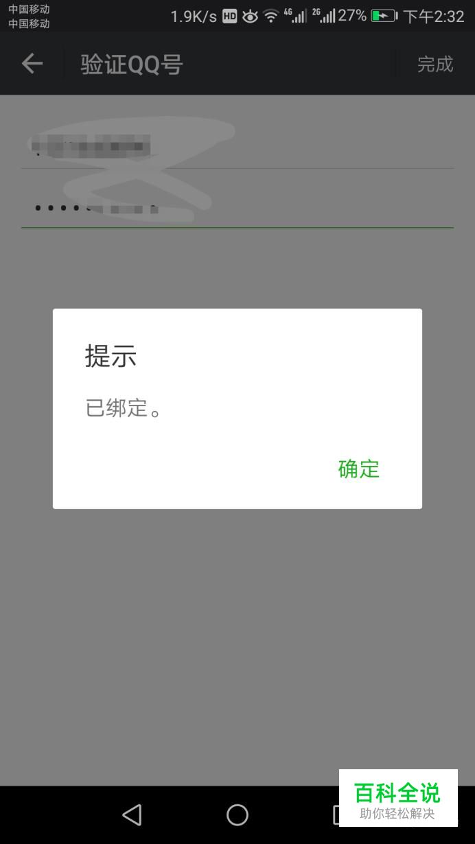 第七步,输入QQ号账号和密码,进行验证,在点“完成”,则绑定成功,设置好后,就可以使用QQ号登陆微信,如图