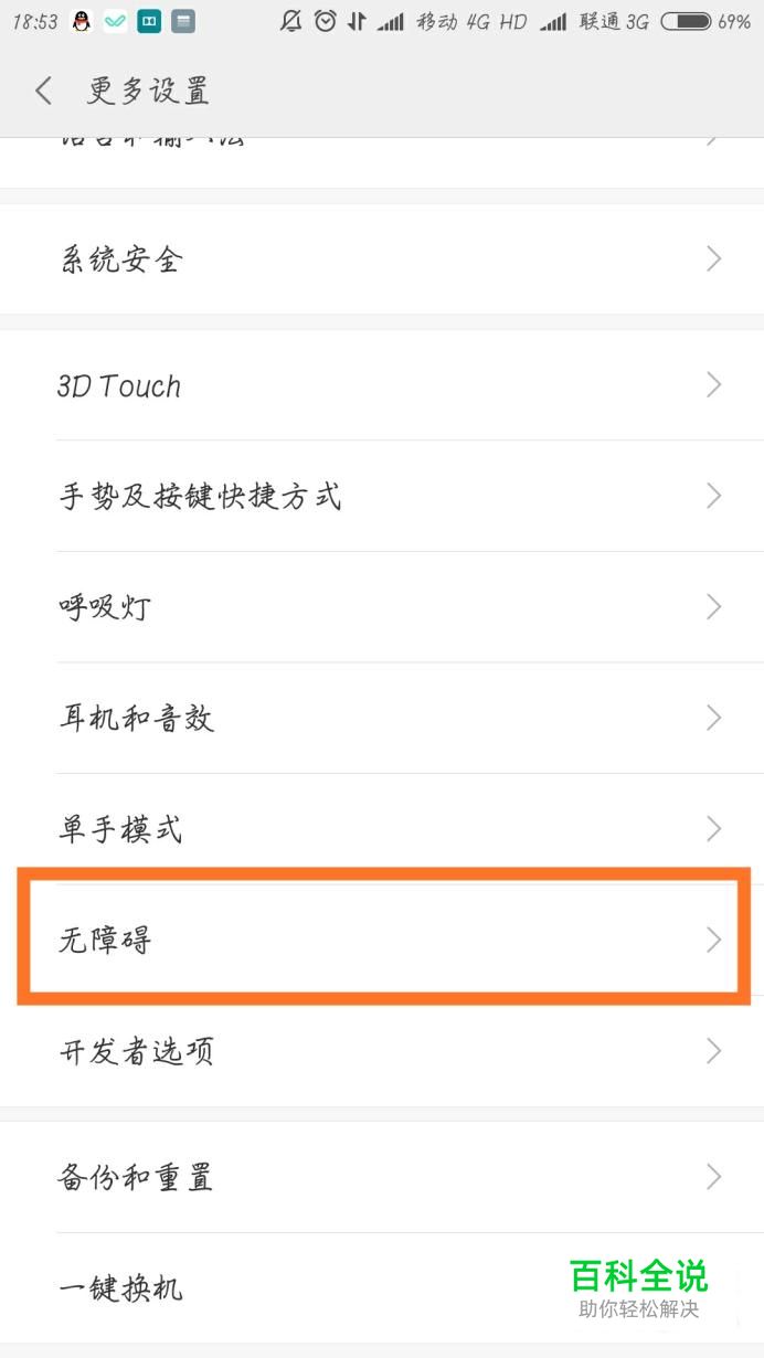 在更多设置中找到无障碍选项,点击进入