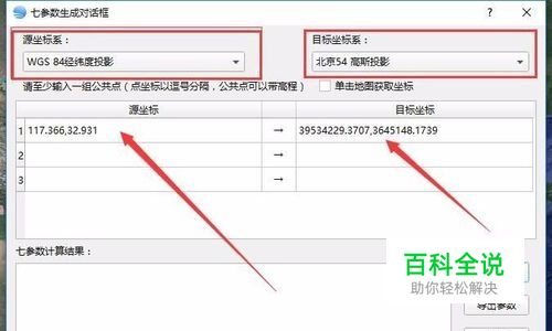 源坐标系选择BIGEMAP地图上的坐标,目标坐标系选择北京54的坐标(CAD中的坐标),坐标以逗号间隔,如下图: