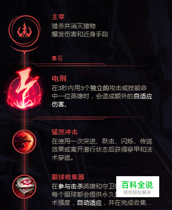 主符文系依次为:主宰,电刑,猛然冲击,眼球收集器,无情猎手