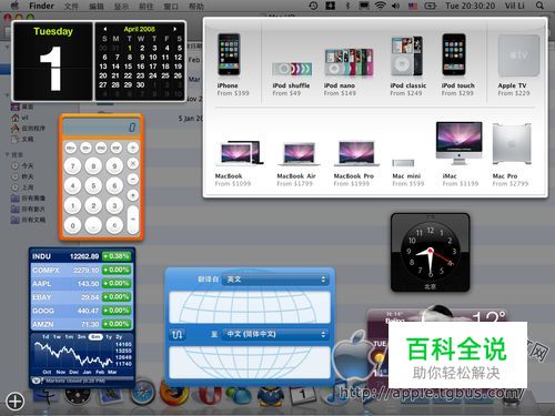 通过Dock上的Doshboard快捷或通过屏幕热点角触发系统的Dashboard功能后,很多基于Dashboard的小工具就显示出来了。
