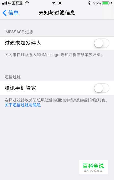 打开【设置】-【信息】-【未知与过滤信息】,将腾讯手机管家设置为开启,然后双击home键回到手机管家页面;