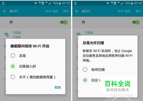三星S6省电设置2:wifi设置 在WIFI设置中选择更多,分别选择睡眠期间保持WIFI开启-仅限接入时;总是允许扫描-仅在WIFI开启时扫描