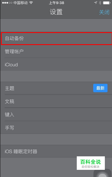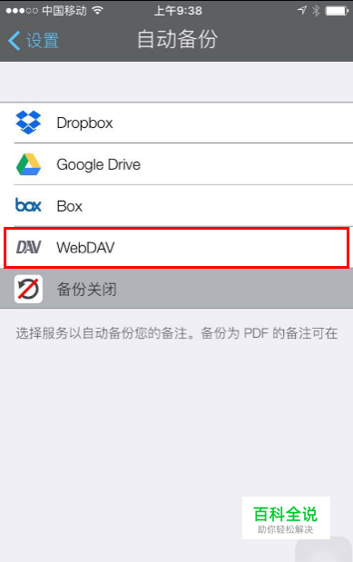 打开notability,选择“设置”->“自动备份”->“WebDAV”