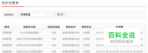 1、在“个人中心”内的“我的优惠券”中,选择好游戏,点击“查询”按钮,即可看到您在此款游戏下拥有的优惠券相关信息。如下图: