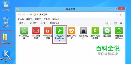 运行桌面上“更多工具”中的“分区工具DiskGenius”,检查一下自己计算机的分区情况,因为我们安装的系统环境是在MBR格式下安装,(如图)以下是MBR格式的分区状态,一个主分区其他的都是扩展分区。