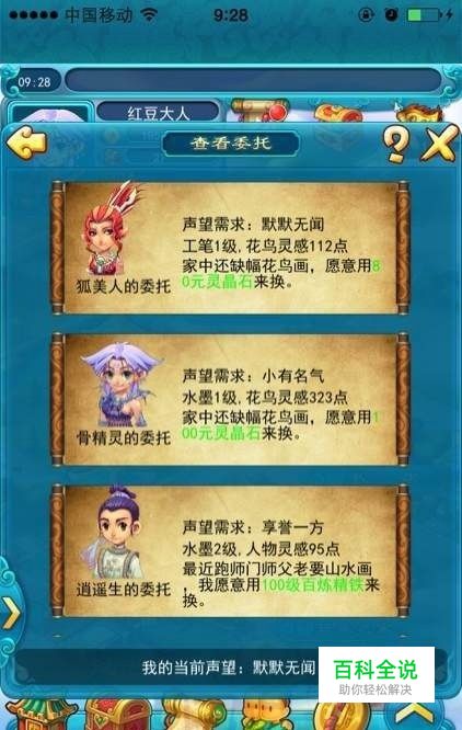 再说下声望 这个东西决定你可以接什么样的任务 跟画出来的画品质也有关系!开始都是默默无闻 想出神品应该比较难,我做了两个默默无闻的委托 声望现在50%升级吧 还在画行拍卖过一次 不知道加不加声望