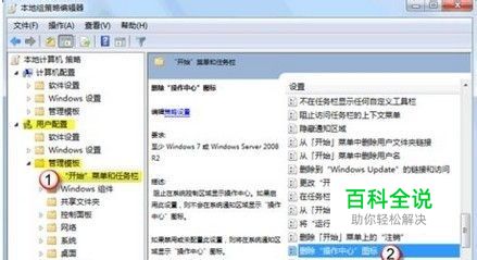 在“用户配置”下依次打开“管理模板”>“开始菜单和任务栏”;在右边细节窗口,找到并双击“删除操作中心图标”选项。