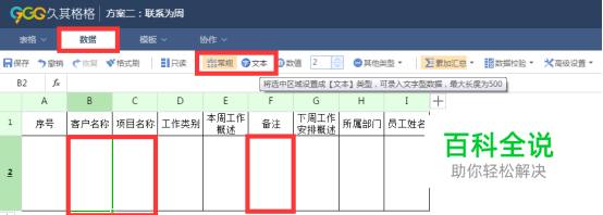 3.4.1 只读、常规、文本、大文本 ① 只读:设置自动显示的单元格、表头等默认为只读格式,填表人无法修改。 ② 常规:无特定格式 ③ 文本:最大限度为500字符 例如“客户名称”B2、“项目名称”C2、“备注”F2皆可设置为常规或者文本。 ④ 大文本:选中要设置的数据单元格,点击【数据】-【其他类型】-【大文本】,最大长度8000字符,例如E2、G2单元格,“本周工作概述”、“下周工作安排概述”设置为【大文本】 3.4.2 千分位、小数、整数 ① 千分位设置方法:选中要设置的数据单元格,例如C3、D3、E3、F3、G3单元格,点击【数据】-【数值】,自动显示千分位形式,数值后面的默认值2,表示小数位数2位,可手动调整。 ②小数:选中要设置的数据单元格,点击【数据】-【其他类型】—【浮点】,浮点类型后面的默认值2,表示小数位数2位,可手动调整,例如“金额”,d3单元格设置为浮点,2位小数。 ③ 整数:选中要设置的数据单元格,点击【数据】-【其他类型】—【整数】,例如“积分”C3、D3、E3、F3、G3设置为整数类型。 3.4.3 布尔类型 适用于是否等判断场景,选中要设置的数据单元格,【其他类型】—【布尔】,例如“是否阅读”、“是否可节约”D2、F2设置为布尔类型。 3.4.4 日期、日期时间 选中要设置的数据单元格,点击【数据】-【其他类型】—日期/日期和时间,选择“日期和时间”格式可以自动显示填表人数据录入时的时分秒,选择“时间”格式,可以在填写数据时自由选择任何年月日,也可以手动输入,例如2016-6-1,见下面两个图C2单元格显示效果区别。 3.4.5 图片 选中要设置的数据单元格B2,点击【数据】-【其他类型】-【图片】 3.4.6 附件 选中要设置的数据单元格E2,点击【数据】-【其他类型】-【附件】,设置成功后出现曲别针符号,添加完之后(0)变为(1)或者其他数值,表示共有几个附件,即上传成功,暂无预览功能 3.4.7 下拉项 ①下拉项设置步骤 第一步,选中需要设置为下拉项的单元格D2,选择【数据】-【其他类型】-【下拉项】 第二步,弹出的窗口中选择【字典管理】,新建下拉项内容,或者对已有下拉项内容进行管理。 也可以通过【数据来源】对应的下拉菜单选择已有下拉项。 第三步,点击【创建】,添加一个新的下拉菜单 在下拉项下面的空白行输入菜单内容,支持从excel复制粘贴内容到此区域。 ② 下拉项层级关系设置 通过升级降级创建多级下拉菜单,通过上移、下移调整菜单位置。 ③ 下拉项显示设置 点击【其他设置】右侧的,展示隐藏菜单 显示模式可以选择【下拉显示】 也可以选择【罗列显示】 3.4.8 汇总设置 久其格格对于数值类型自动累加汇总,其他汇总方式如下: (1)不汇总:例如文本信息、身份证、手机号等不需要汇总的内容,设置数据单元格为不汇总,例如B3单元格。 (2)计数汇总:例如统计物品数量时使用。对于布尔类型的单元格也可以通过计数汇总统计结果,默认计算勾选的人数总和。 或者统计人数时使用,例如A2单元格设置为计数汇总,可以自动计算出共有多少人参与填写。 (3)累加汇总:例如对D3、E3、F3、G3设置为累加汇总后,对于多人填报的数据能够自动计算出合计值。 (4)平均值汇总:适用于求平均数 (5)最大值/最小值汇总:适用于选中数据区域筛选出最大值/最小值 3.4.9 数据校验 可以用于校验单元格内数据值范围、文本长度、唯一性、身份证,也可以校验单元格不允许为空。 3.4.10 高级设置 (1)自动显示序号 选中A2单元格,点击【数据】-【高级设置】-【自动编号】 设置成功的效果如下图 发布后的展示效果如下图,在第2行以后录入的数据,序号会自动显示2、3、4…… (2)自动显示填表人昵称 选中I2单元格,点击【数据】-【高级设置】-【小伙伴名称】 设置成功后注意I2单元格变为绿色底纹 发布后,I2单元格自动显示填表人昵称,也是他的久其格格账户昵称。 (3)枚举管理 点击A处【创建】可以新建一个新的下拉菜单,点击B处可以对下拉菜单进行编辑、修改、删除。 B处能够直接在当前页面进行修改,主要适用于文字编写错误等情况,方便及时修改。如果要想添加或者删除某个下拉菜单,点击进入编辑界面。 进入编辑界面后,双击某一行进行编辑,右侧按钮分别为插入、删除按钮。 (4)枚举联动 例如想要设置省、市、县的枚举联动效果,步骤如下: ① 对于省份对应单元格设置为【数据】-【其他类型】-【下拉项】 下拉项数据例如下图,包括各个省份、市、区县 设置好的下拉项见下图 ② 点击【数据】-【高级设置】-【枚举联】 分别点击省份、市、县区对应单元格的【添加】 添加后的效果见下图,点击保存 如果枚举联动设置错误,可以再次点击枚举联动按钮,对于已设置区域单元格背景为绿色底色。 (5)浮动区域属性 固定行数是指表格建立之初如果只有1行可填写区域,那么填表人只能在此行录入,不会自动增行,也无法插行;如果设置了最大行数为5,填表人不可录入第6行,也无法实现插入第5行以后的行。 总结,数据格式进行设置时,在下图红框处选中单元格,点击【数据】对应的格式设置内容。