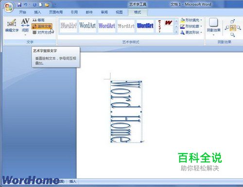 在Word2007文档中,艺术字一般均为横排文字方向。用户可以根据排版需要为艺术字设置竖排文字方向,操作步骤如下所述: