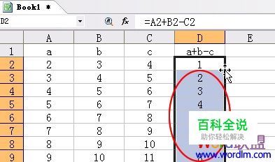 鼠标变成黑十字,双击,看看,剩下数的都按公式“a+b-c”计算好了,见图2: 图2