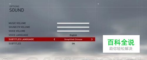 中文字幕设置(剧情对话语言) OPTIONS——>SOUND,找到SUBTITLES LANGUAGE,选择Simplified Chinese(简体中文)。