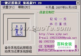 “使用期限设置”此功能让管理员设定用户使用一键还原精灵的期限。 “使用PQDI内核”或“使用GHOST内核”此功能是在某些电脑上不能用GHOST备份时调用PQDI进行备份还原。建议只有在GHOST不能使用时才使用PQDI内核。 密码系统使用说明: 一键还原精灵有一个安全的密码系统,分别设有管理员密码及用户密码。 如果设置了管理员密码,进入“高级设置”及使用安装程序的工具箱中“备份分区表”、“运行PQMAGIC”、“运行GHOST”“转入DOS”及“卸载精灵”选项时需输入密码,以保证一键还原精灵系统的安全性。 如果设置了用户密码,在备份、还原系统时需输入码。(注意:要先设置管理员密码才能设置用户密码) 管理员密码享有系统控制权,可以代替、更改用户密码。 密码系统很适合装机商给客户的电脑设置管理员密码,只让客户使用备份(也可在高级设置中禁止用户备份系统)、还原系统功能,不能使用高级设置,以保证系统及永久还原点的健康。
