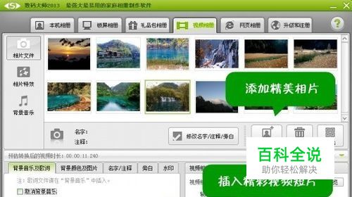 导入制作视频MV的相片、视频短片素材 首先,点击“视频相册”选项卡,切换到该面板,然后点击“添加相片”按钮将相片悉数导入软件中,然后点击“插入片头/片尾”按钮以及“相片间插入视频短片”按钮,即可将你的照片和匹配的视频短片一起导入软件制作MV视频了,让相片和视频短片完美融合。通过鼠标点击拖拽相片列表的相片,快速调整相片的播放顺序。