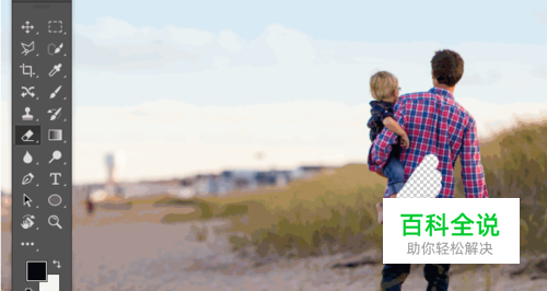 橡皮擦工具 橡皮擦工具,更多时候跟“抠图”看似没啥关系,然而,竟然它能起到“擦除”的作用,那么就完全可以用来抠图去背了,它的键盘快捷键是:单按一个字母键“e”,简单粗暴地擦掉你不想要的背景或其他画面部分就可以了。 橡皮擦工具用起来方便,选择了它,调节画笔大小和硬度即可开始擦擦擦。然而,缺点也比较明显,很难做到精细化抠图,对边缘的处理也不是太好,而且擦掉就真的没了,原图被破坏。阿随君这里并不推荐使用,只做了解,它结合“图层蒙版”来用的话,效果还是不错的,往后看会细讲的。