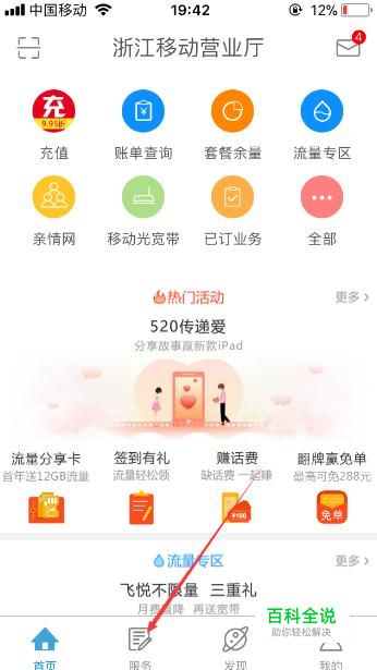 进入到手机移动营业厅页面后,之后再点击【服务】按键。