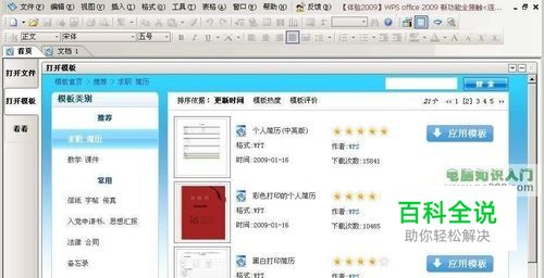 在网络模板的导航区点击“求职 简历”,主选区中即会出现各种求职简历的模板,默认的排序依据是“更新时间”,你也可以通过界面上方的“排序依据”选择“模板热度”或“模板评价”来排序,以便更快地找到中意的模板。