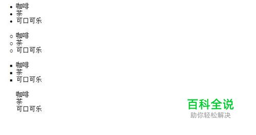 <html> <head> <style type="text/css"> ul.disc {list-style-type: disc} ul.circle {list-style-type: circle} ul.square {list-style-type: square} ul.none {list-style-type: none} </style> </head> <body> <ul class="disc"> <li>咖啡</li> <li>茶</li> <li>可口可乐</li> </ul> <ul class="circle"> <li>咖啡</li> <li>茶</li> <li>可口可乐</li> </ul> <ul class="square"> <li>咖啡</li> <li>茶</li> <li>可口可乐</li> </ul> <ul class="none"> <li>咖啡</li> <li>茶</li> <li>可口可乐</li> </ul> </body> </html>
