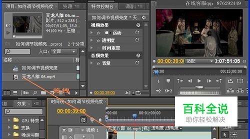 通过预览视频我们可以看到视频很黑,明显的亮度不够,那么接下来我们就要调节视频亮度了。需要用到调节视频亮度软件的一个视频特效,来到软件的左下角效果,找到视频特效,点击打开下拉菜单,再找到色彩校正,然后找到亮度与对比度。用鼠标把亮度与对比度拖拽到视频素材上面。就会在特效控制台上面看到添加的亮度与对比度特效了。 点击打开下拉菜单,调整亮度与对比度的参数,如下图所示。当然,下面的参数我只是针对我需要调整的视频而言,你可以尝试着调节直到合适就可以了。很明显的,设置好了参数之后视频的亮度马上就变亮了。