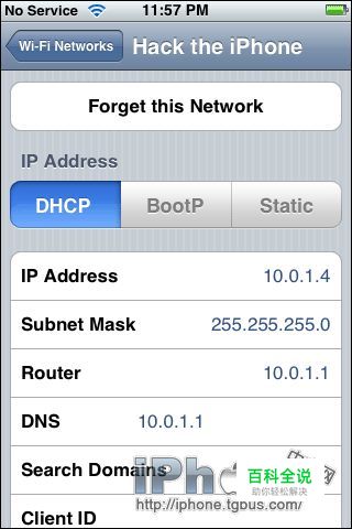 2.进入setting → WiFi,选择你要连接的无线网络后,查看并记录下你的iPhone IP地址(IP Address)。
