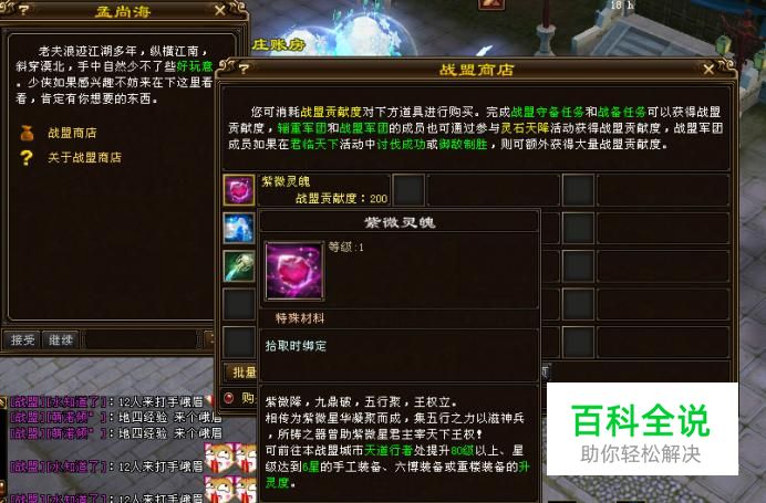 找到后勤公告栏,每周可以做35次任务获得盟贡,然后找到战盟商店管家孟尚海,购买紫薇灵魄