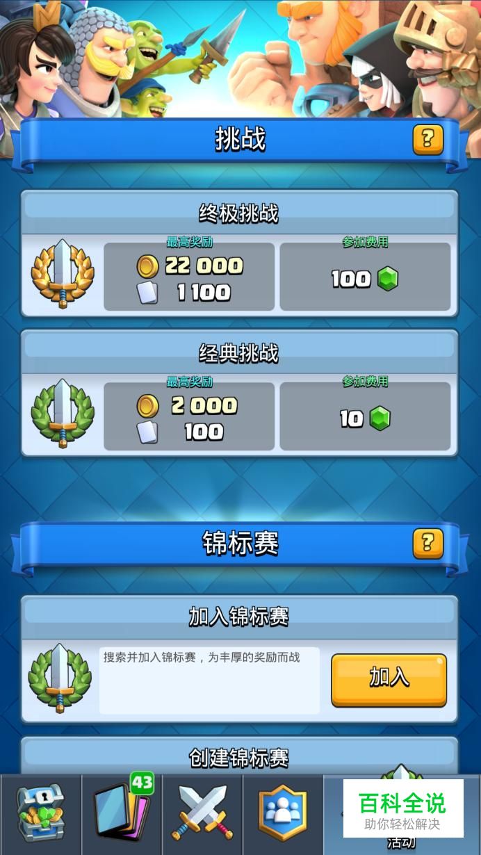 最后要说的就是最右边的那个挑战,每隔一段时间他都会刷新,就会有免费的挑战,一定要去打就算一把都赢不了也要去打,因为我也从来没赢到最后过,但是中间可以获得很多的金币。传说卡这个东西我认为是当你达到9阶之后才会随机出现的有时候就是开白银的盒子都有可能出现,当然越稀有的宝箱出现的几率越大。其实传说卡并没有想象的那么厉害因为等级很难升上去,还不如去搞稀有卡和史诗卡。