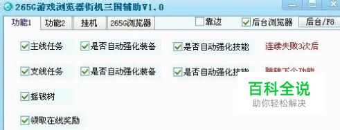 街机三国作为时下最为热门的横版格斗类页游深受玩家们的喜爱,对于那些热爱格斗PK缺没有充足时间练级的玩家朋友们来说福音到了。街机三国265G辅助在此独家首发了,希望对于有需求的玩家有所帮助。 由于此辅助需要在玩家265G的专业浏览器下运行,玩家可以首先先登录265G游戏浏览器的首页。 然后点击安装程序,按照步骤把265G浏览器安装好。 安装好了265G浏览器以后,玩家接下来要做就是下载265G的专用街机三国辅助了 玩家们在用265G浏览器登录游戏以后,点开街机三国的辅助以后就可以正常的运行次辅助了。 辅助功能: 1.自动主线任务[是否创建队伍打主线] 2.当无主线任务时,自动支线任务 3.自动日常任务 4.自动组队精英副本(有超过X 个人,就开始打) 5.自动组队魔王副本(有超过X 个人,就开始打) 以下功能(每完成一次任务,去竞技看下,能打就打) 6.自动竞技 7.自动领取在线奖励 8.自动打摇钱树<这个目前浏览器的加速功能可以用 9.自动领取登陆礼包 在勾选好了你所需要的功能以后,玩家们点击挂机选项中的开始挂机按钮就可以开始挂机了。 由于本辅助是纯模拟手工操作的,并不是类似于其他外挂那样破坏游戏本身的平衡,所以玩家们可以放心使用。玩家们要注意的是,运行辅助的时候你的游戏一定要用265G浏览器打开哦,如果玩家还有一些其他合理的的功能需求可以留言给我们,我们会第一时间给玩家们回复的。