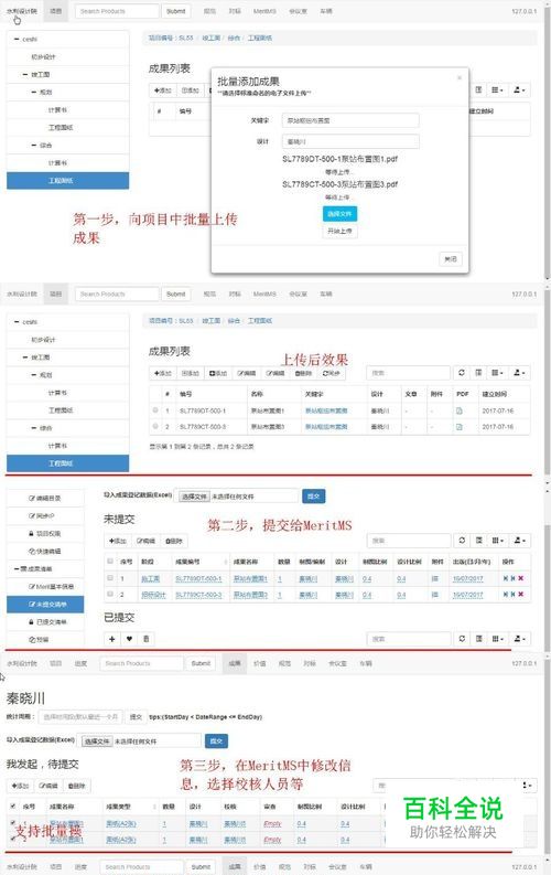 工程师向EngineerCMS中上传设计成果,它会自动截取编号和名称。同时,自动生成成果清单,清单带有链接附件,准备提交给MeritMS.