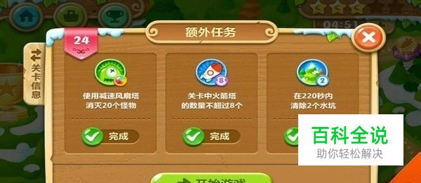 24关攻略,保卫萝卜2森林主题24关怎么过。 首先想要获得水晶、金萝卜一定要完成关卡的额外任务,完成任务不仅可以获得水晶金萝卜的成就还可以获得宝石,宝石可以在商店里购买一些技能,比较困难的关卡可以选择使用技能来通关,可以降低通关难度的哟,另外宝石还可以购买萝卜宝宝的形象。 【额外任务】 一、使用减速风扇塔消灭20个怪物。 二、关卡中火箭塔的数量不超过8个。 三、在220秒内消除2个水坑。 保卫萝卜2第24关攻略 【额外任务】 想要获得更多宝石就要完成额外任务哦。 建造一个风扇塔(满级)同时清除标记的道具。 将获得的瓶子塔升满级,清除标记的道具。 将获得的瓶子塔升满级,清理标记的道具。 建造一个多重箭(满级),清理道具。 建造一个火箭塔(满级),清理附近的道具。 建造一个风扇塔,将获得的太阳塔依次升满级。 建造一个多重箭(满级),消灭完怪物清理大树。 建造一个火箭塔升一级,清除周围道具。 建造风扇塔(依次满级)减速怪物,太阳塔(满级)。 清除最后一个道具。 建造一个风扇塔(满级),火箭塔和太阳塔升满级。 建造一个火箭塔(满级),增加输出。 大量建造火箭塔(不超过8个),便便塔升满级(更好的减速)。 总结:风扇的攻击、减速效果都不错,建议可以多出一点。