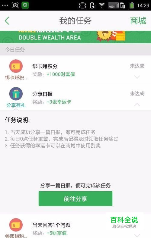 找到“分享日报”任务列表 打开手机上的百度知道APP,在首页下面的菜单栏下点击“活动”,再出现的页面中点击“我的任务”,进入到任务列表页面,就可以看到“分享日报”的任务列表了。 按提示,点击绿色按钮“前往分享”就开始做任务啦。