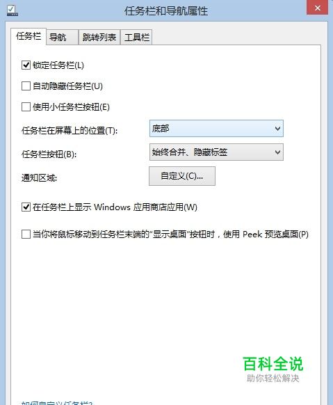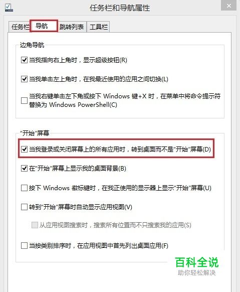 在上方选择导航选项,进入,将“当我登陆或关闭屏幕上的所有应用是,转到桌面而不是开始屏幕”的勾去掉即可