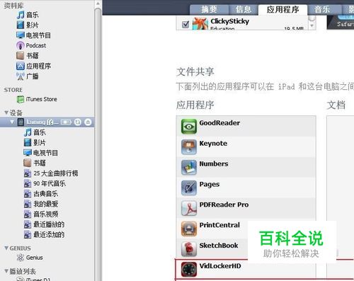 回到itunes设备上的应用程序,将画面拉到最下面,会看到有个文件共享区。