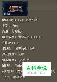 枪魂极寒冰魄枪械属性解析 冰冻枪系列 枪械名称: LV12 极寒冰魄 类别: 自动 类型: 冰冻枪4 购买条件: 消耗金币3000000 声望150000 主属性: 伤害加成:46% 弹药数量: 无限 射击速度: 1.5发/秒 附属性: 攻击多个敌人 4秒内降低对方40%的移动速度秒内降低对方40%的移动速度
