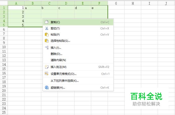 选择需要转换方向的所有单元格,并点击右键,打开菜单,选择“复制”选项。