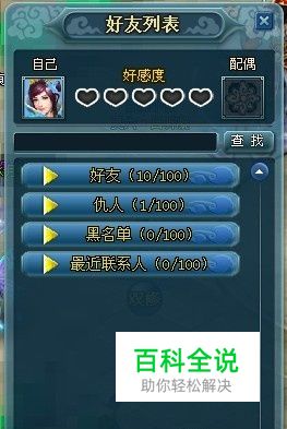 好友系统界面 1.好友 该类为您游戏里的好友,陪伴着你一起走过百炼成仙之旅。 2.仇人 该类为您的仇敌,当您被对方杀死时,对方的名字将出现在这,请牢记这列表里的人,山水有相逢啊! 3.黑名单 该类保存恶意骚扰您的人,将对方添加到此后,对方除喊喇叭外的一切信息都将不再出现您的视线。 4.最近联系人 该类保存最近跟您有交际的玩家,如组队等,只保留三天内的信息。
