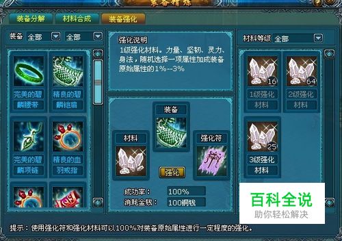 二、强化系统介绍: 装备强化在仙园洞府的锻造台装备精练进入强化界面,强化需要强化材料和强化符进入强化界面,强化需要强化材料和强化符强化装备所需的强化材料可以通过装备分解获得,也能在仙境获得,强化符在飞云阁普通商人处购买获得。