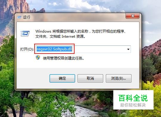 在运行程序中输入regsvr32 Softpub.dll并回车,从而完成注册。