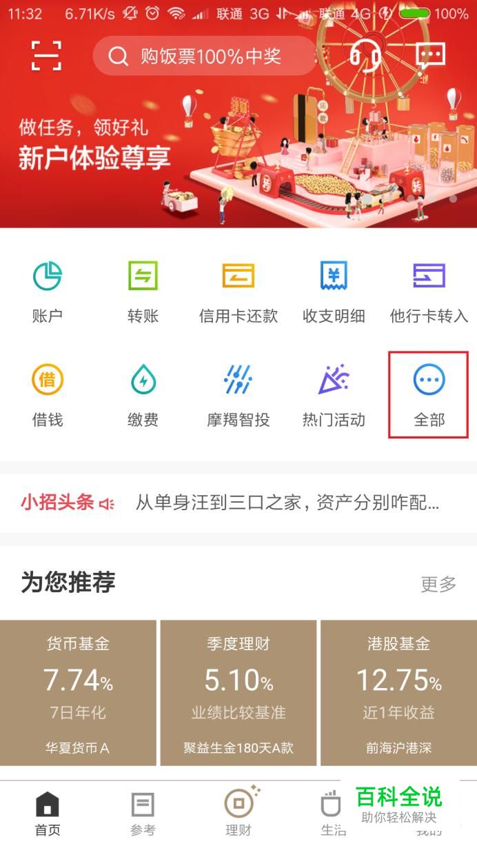 首先,打开招商银行App应用主页面,点击页面中的“全部”菜单按钮。
