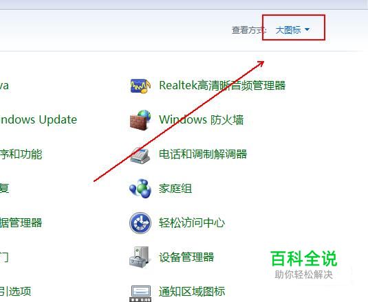 在“控制面板”中将“查看方式”更改为“大图标”选项。