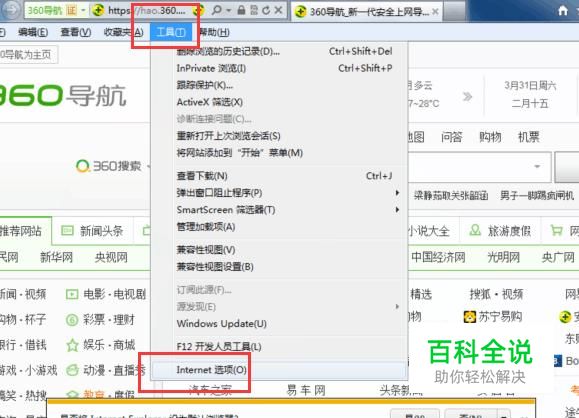 Internet选项 首先打开Internet浏览器,然后点击工具栏中的【工具】选项,在弹出的菜单中选项【Internet选项】,如下图所示: