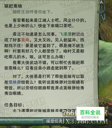 任务目标:去飞瀑潭附近除掉嵩蛛并拿回些嵩蛛卵交给山腰茶铺的陆旺生做药材。