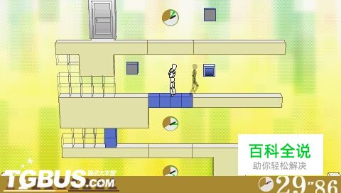 一些基本的机关 既然叫做解谜游戏,那么当然不会让你一马平川地过关。游戏里充满各种复杂的机关和障碍,稍一不慎就会让你前功尽废,真的是不简单。不过俗话说得好:知己知彼,百战不殆,下面就让我来为各位介绍一下游戏里的各种机关,这样至少大家在看见新机关的时候不会惊惶失措,不知如何是好。颜色机关:最基本的机关,按下按钮可以使与之颜色相同的颜色方块消失或者显现尖刺方块:一旦你背向它便会向你冲来的方块,被碰到会直接进入下一个cast迷惑机关:跟颜色机关一回事,不过正确的按钮只有一个,注意每关的正确位置都会改变脚踏机关:也是颜色机关的变形,要踩住才能启动 桥:走近后通过连打圆圈键推倒,推倒后可以当做通路计时门:当指正在绿色区域的时候会打开,其他时间关闭的门。要掌握好时间来通过。 跳跃机关:颜色机关变种,会一上一下地跳动,目的自然是浪费你的时间。计时器:启动后经过一段时间便会复位的颜色机关,使用的时候绝对不能犹豫不决。墙壁:挡路的墙壁,连打圆圈推倒。跳板机关:依旧是颜色机关的变种,不过今次是让跳板或者洞口显现。单行道:顾名思义,只能往一个方向走的机关,有些能通过颜色机关变向。顺序机关:按照顺序一一出现的机关,处在不同平台的时候会带来很大麻烦。黑暗:大概是停电了……这种情况下只能看到有限的范围,不过可以通过开启机关增加可视范围。另外自己与影子的可视范围重叠时可视范围会变大。多重脚踏机关:要同时踩下才能启动的机关,注意这里的同时踩下是对双方而言的,不能一个人先踩另一人后踩。不过这种脚踏机关启动后即使离开不会复位。 塌方方块:出现在最后一行的关卡的机关,随时间流逝会自动落下,非常麻烦。