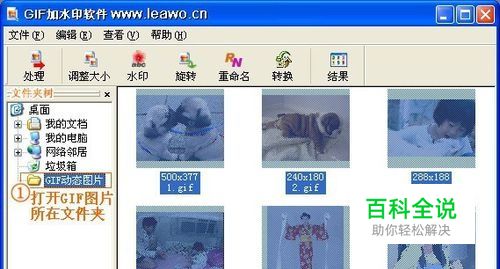 打开本文提供的免安装的gif加水印软件,如下图,默认界面左边有个“文件夹树”(如果没看到,勾选“查看”-“查看文件夹树”),找到图片所在目录,打开文件夹,GIF图片显示在右边,可以按Ctrl键选多张图片,或全选图片。