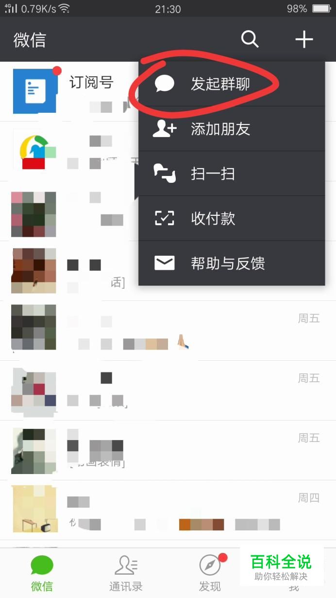 进入微信后,点击界面右上角的加号,选择发起群聊