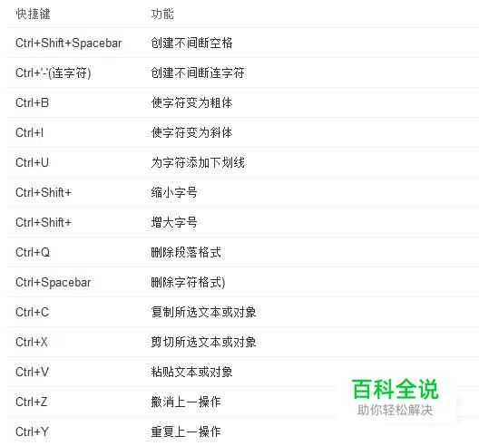 常用快捷键 快捷键 功能 Ctrl+Shift+Spacebar 创建不间断空格 Ctrl+'-'(连字符) 创建不间断连字符 Ctrl+B 使字符变为粗体 Ctrl+I 使字符变为斜体 Ctrl+U 为字符添加下划线 Ctrl+Shift+ 缩小字号 Ctrl+Shift+ 增大字号 Ctrl+Q 删除段落格式 Ctrl+Spacebar 删除字符格式) Ctrl+C 复制所选文本或对象 Ctrl+X 剪切所选文本或对象 Ctrl+V 粘贴文本或对象 Ctrl+Z 撤消上一操作 Ctrl+Y 重复上一操作