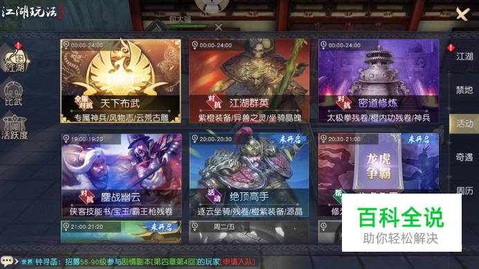 进入江湖界面,在右侧选项中点击“活动”,然后点击“鏖战幽云”进入,完成活动能够获得侠客技能、武学残卷等道具。