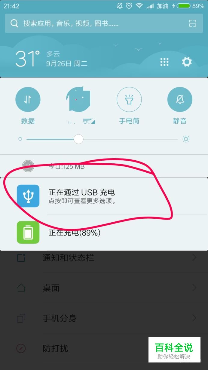 首先手机要和电脑用USB线连接在一起,这时MIUI8系统就非常方便,直接在状态栏会弹出USB的调试选项,如下图: