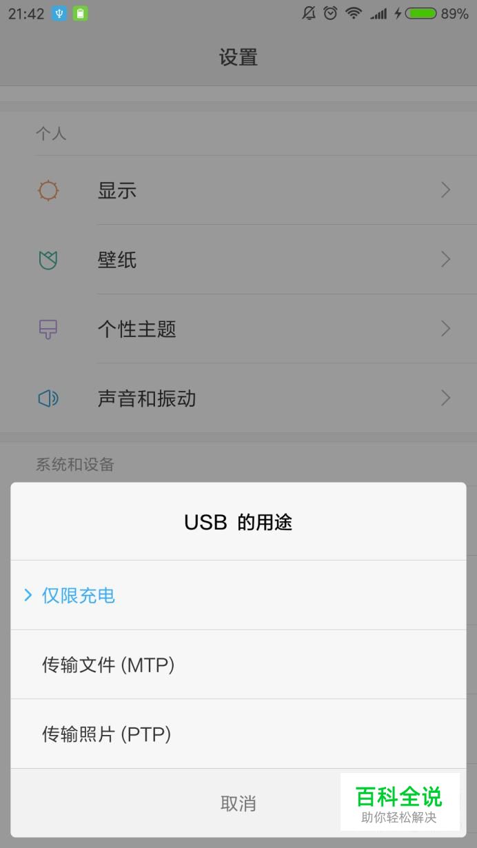 然后点击“正在通过USB充电”,就会弹出USB调试的页面,有“仅充电”“传输文件”“传输照片”三个功能,如下图: